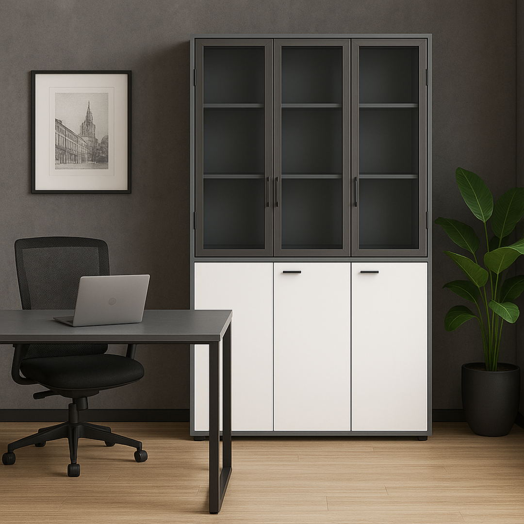 • Distribución Práctica: La sección inferior dispone de tres compartimentos cerrados, perfectos para el almacenamiento discreto de materiales de oficina, carpetas o artículos de mayor tamaño, manteniendo el espacio organizado y libre de desorden.