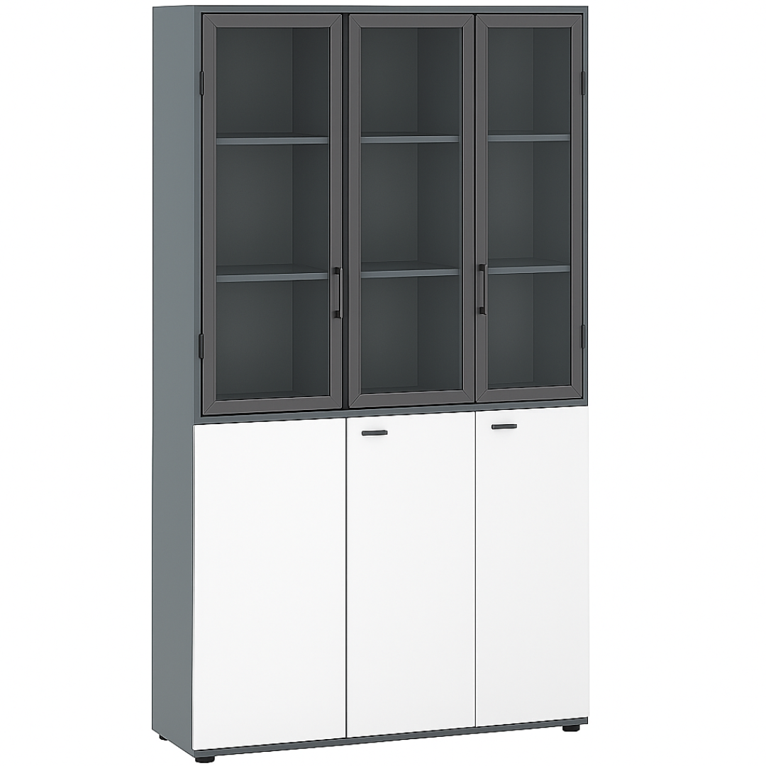 • Puertas de Vidrio con Aleación de Aluminio: La parte superior del armario cuenta con puertas de vidrio templado, enmarcadas con aleación de aluminio, que aportan un toque refinado. Estas puertas permiten la visibilidad del contenido interior, ideal para exhibir documentos, archivadores, objetos decorativos o trofeos, añadiendo un elemento decorativo al espacio.
