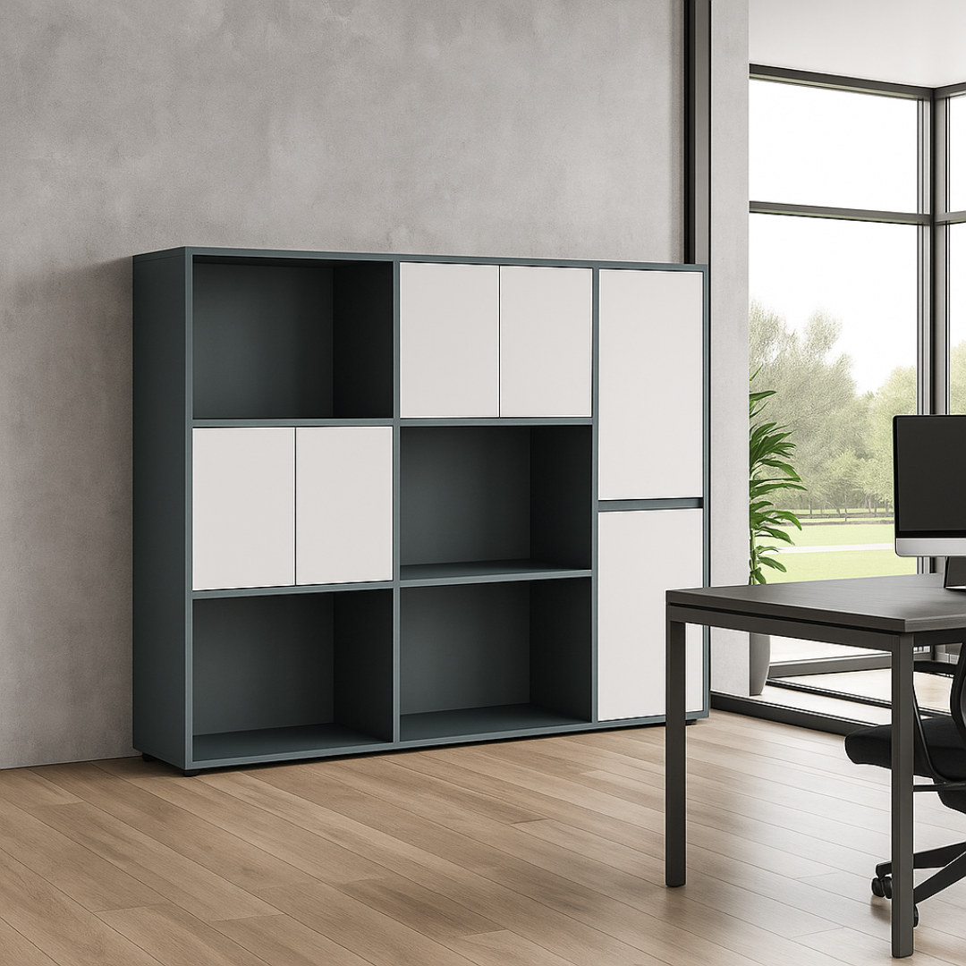 Este armario es una pieza de mobiliario moderna, fabricada con tablero melamínico resistente (PAL), ideal para oficinas, espacios comerciales o zonas de almacenamiento elegantes. Su diseño minimalista, con tonos contrastantes, combina compartimentos abiertos y cerrados, ofreciendo un equilibrio perfecto entre funcionalidad y estética.