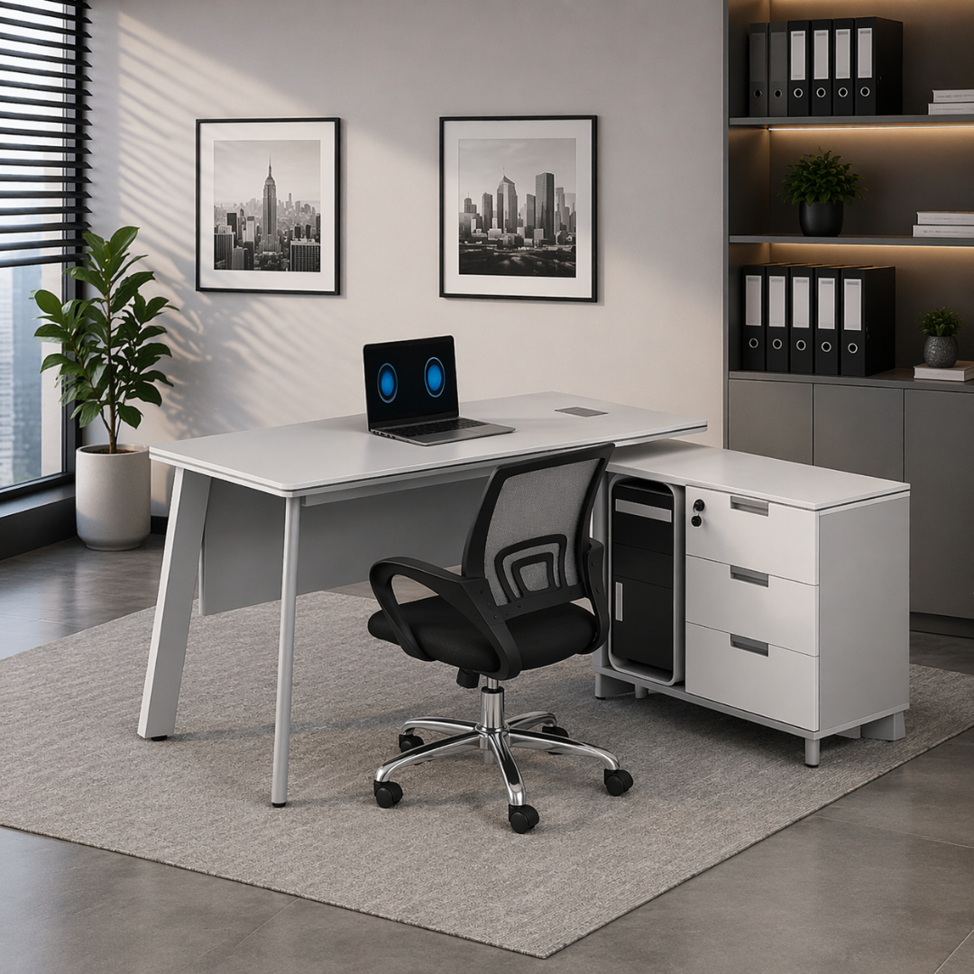 El escritorio, con amplias dimensiones de 1600 x 1400 x 750 mm, ofrece una superficie generosa para equipos, documentación y accesorios. El armario lateral integrado facilita el almacenamiento y permite mantener el espacio ordenado. Por su parte, la silla ergonómica está pensada para garantizar una postura correcta y un alto nivel de confort incluso durante largas jornadas de trabajo.