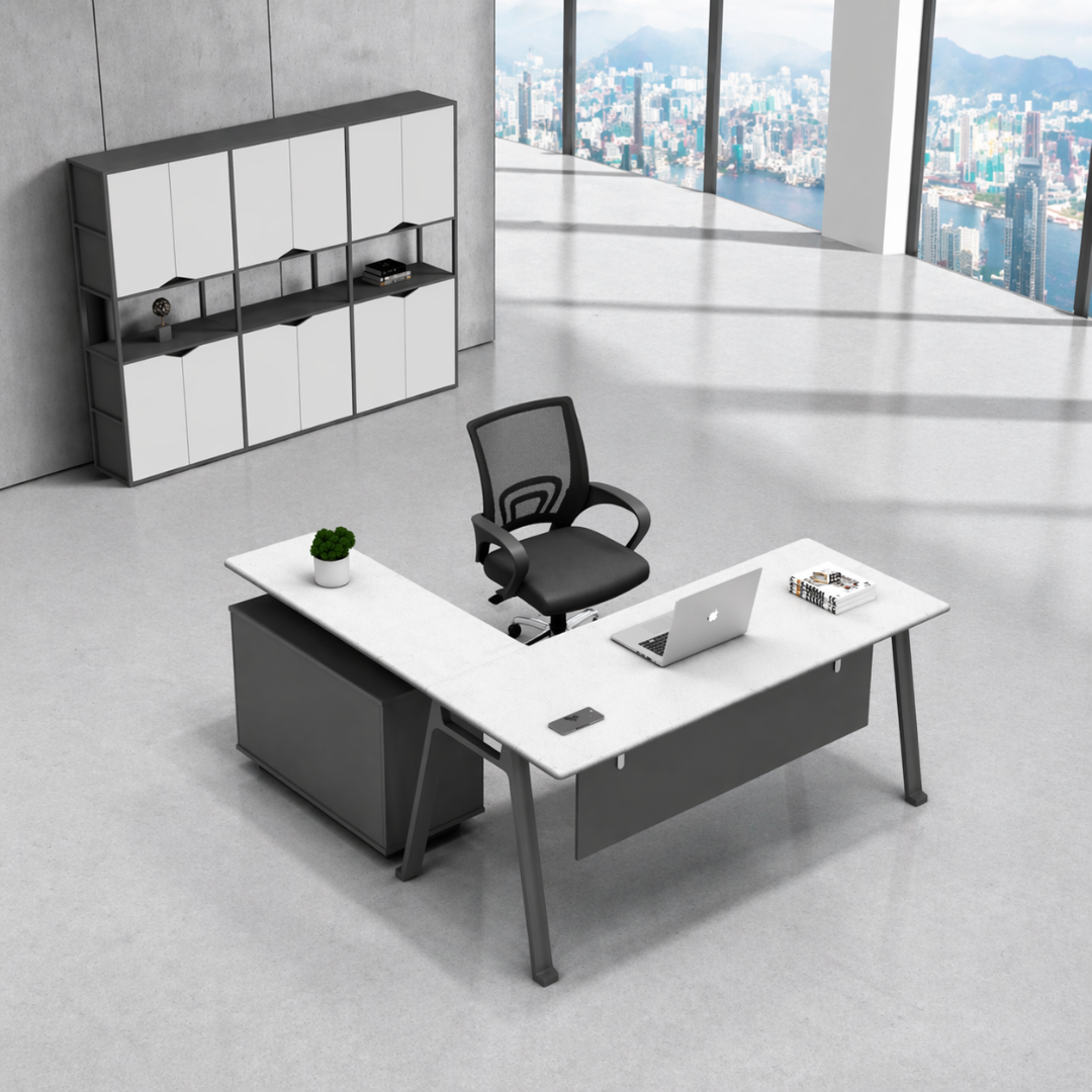 Este conjunto de escritorio esquinero con armario lateral y silla ergonómica es ideal para crear un entorno de trabajo funcional y bien organizado. Su diseño moderno, combinado con materiales resistentes y acabados de calidad, lo convierte en una opción perfecta tanto para oficinas como para home office.