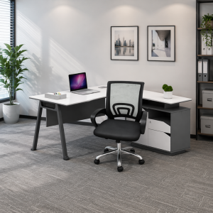 Gracias a su formato esquinero, aprovecha al máximo el espacio disponible, mientras que la silla con respaldo de malla favorece una postura cómoda durante toda la jornada.