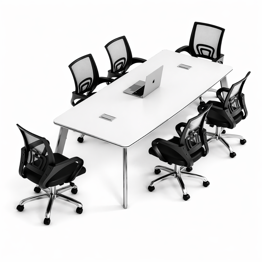 El conjunto de conferencia compuesto por una mesa moderna y 6 sillas ergonómicas es la solución perfecta para crear un espacio de trabajo funcional y elegante. La mesa, de diseño minimalista y con patas metálicas estables, ofrece una amplia superficie ideal para reuniones, presentaciones o trabajo en equipo.