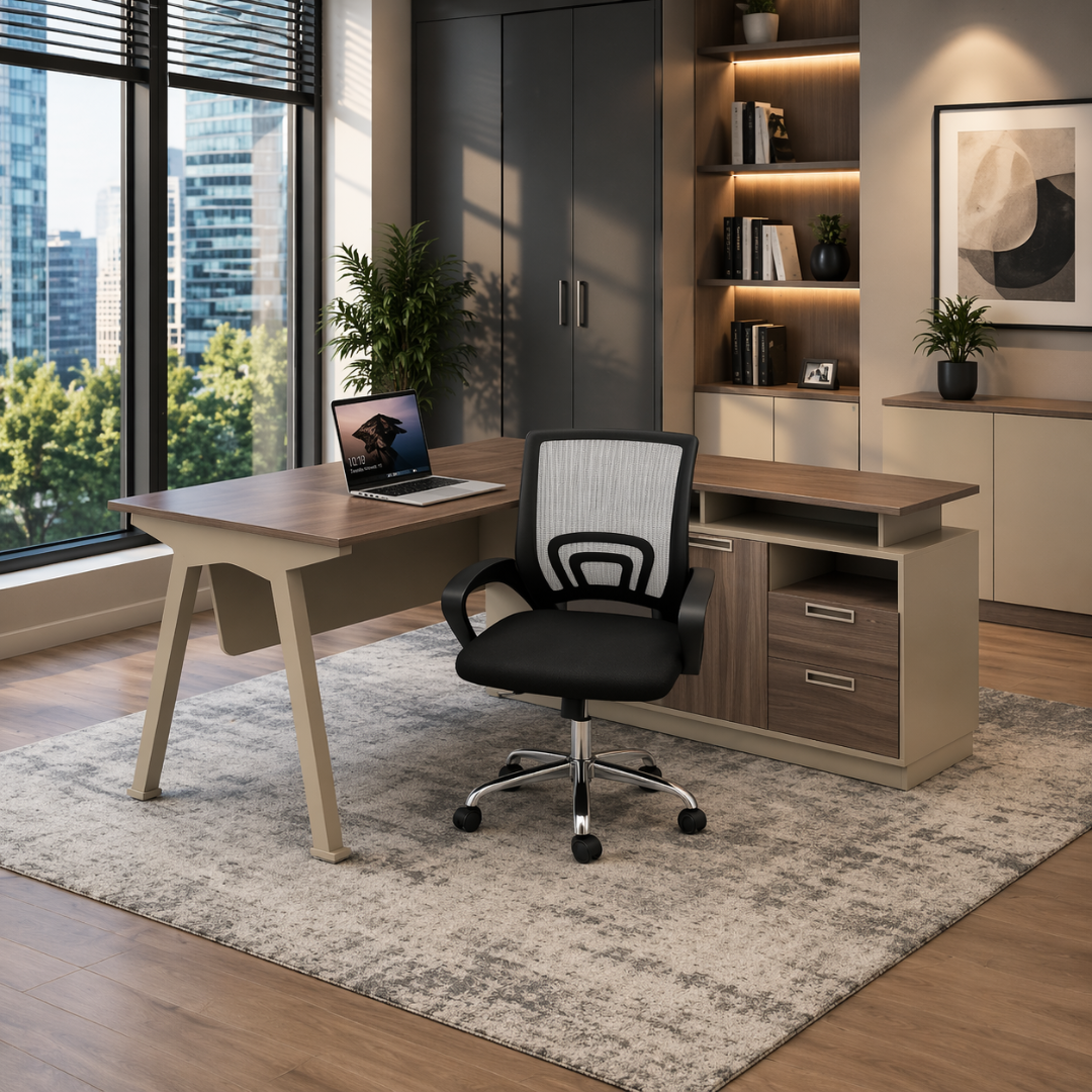 Su diseño contemporáneo, combinado con materiales resistentes, ofrece el equilibrio perfecto entre estética y funcionalidad. Está pensado tanto para trabajar desde casa como para entornos profesionales, proporcionando el soporte necesario para el uso diario.