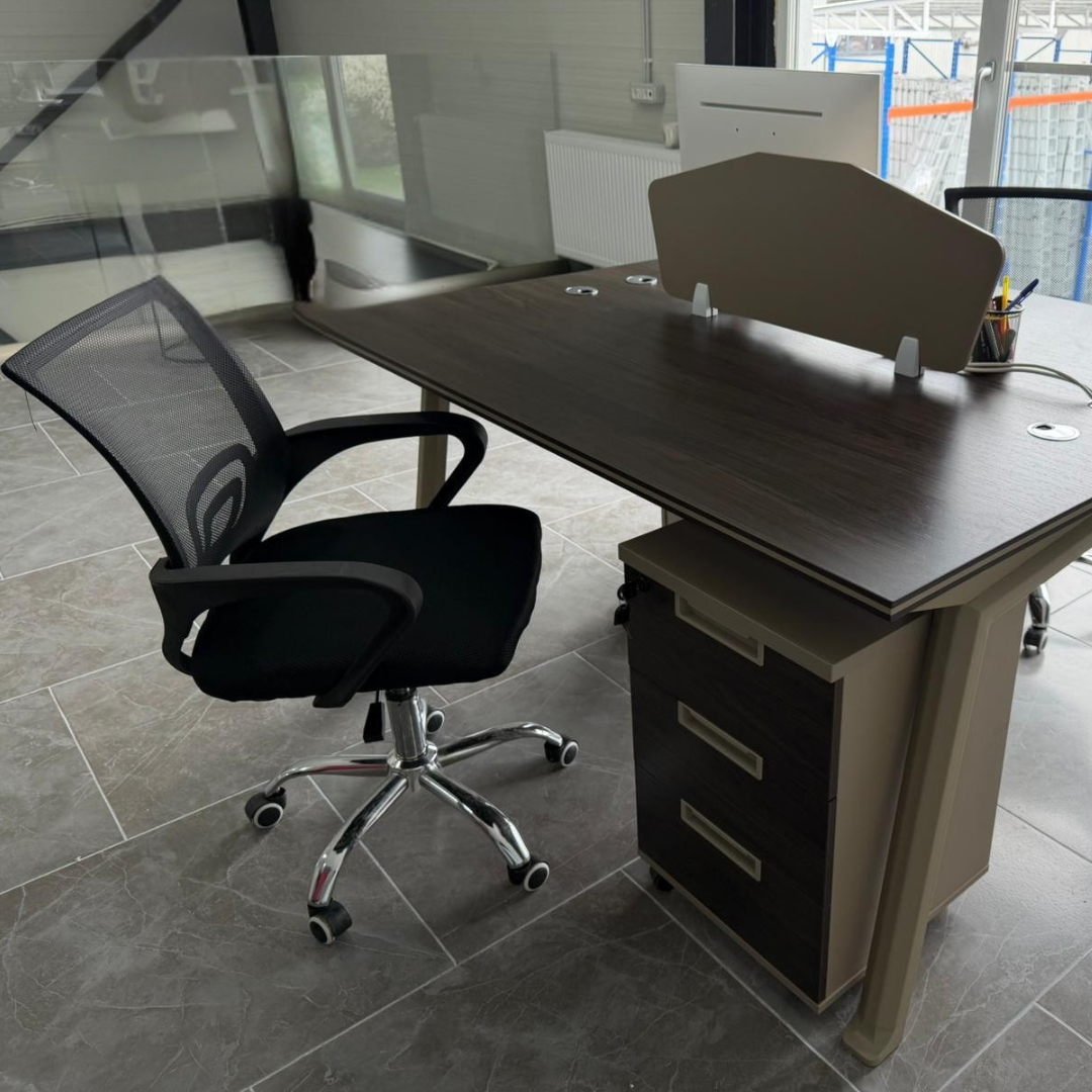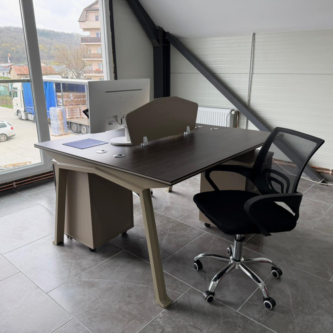 Este conjunto de oficina está diseñado para optimizar el espacio y mejorar la productividad. Incluye un escritorio operativo con dos puestos de trabajo y dos sillas ergonómicas, ideal para oficinas modernas o zonas de coworking.