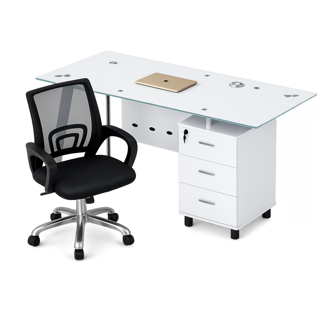 El escritorio incorpora un tablero de vidrio templado que aporta ligereza visual y resistencia al uso diario, combinado con una estructura metálica estable. El armario lateral fijo, con cajones integrados, facilita mantener el orden y tener todo a mano. La silla, por su parte, cuenta con respaldo de malla transpirable que mejora la ventilación y favorece una postura correcta durante largas jornadas.
