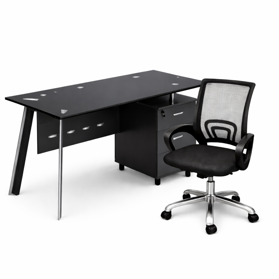 • Conjunto silla ergonómica con respaldo de malla y escritorio con superficie de vidrio y armario lateral fijo 1200×600×750