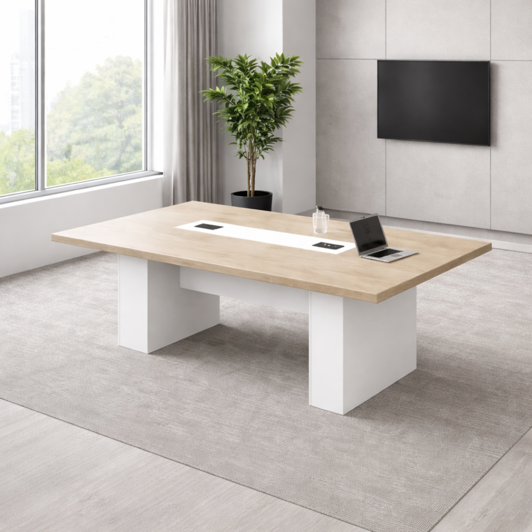 Gracias a sus dimensiones generosas, esta mesa permite organizar reuniones de equipo, presentaciones o sesiones estratégicas de forma cómoda y eficiente. Su amplia superficie ofrece espacio suficiente para portátiles, documentos y accesorios sin saturar el entorno de trabajo.