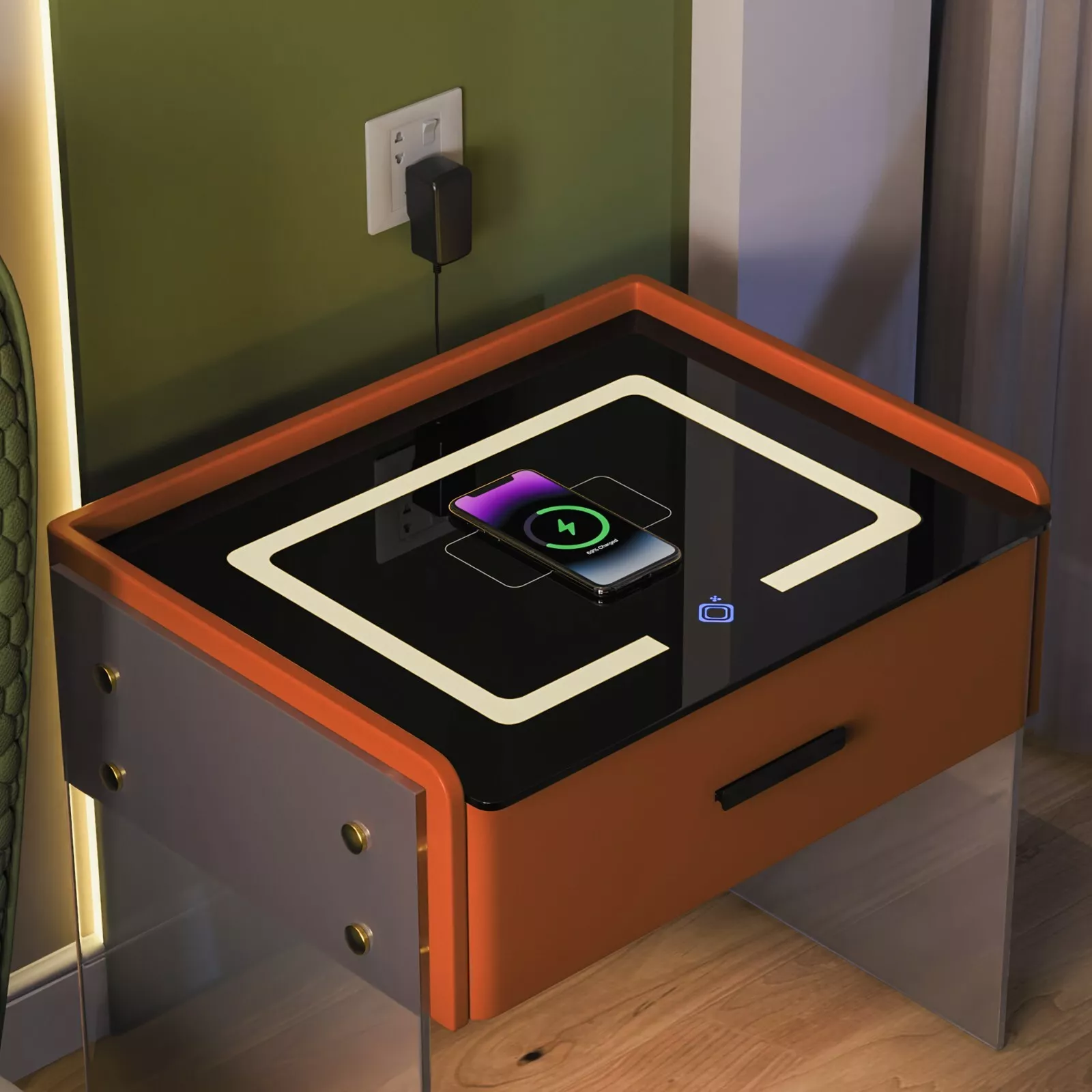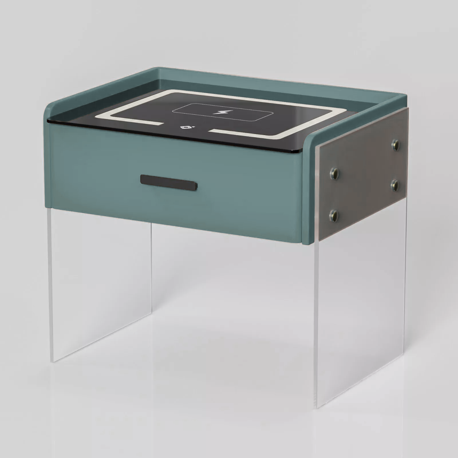 Transforma tu dormitorio con esta mesita de noche inteligente verde, que añade un toque moderno con un diseño elegante y tecnología avanzada.