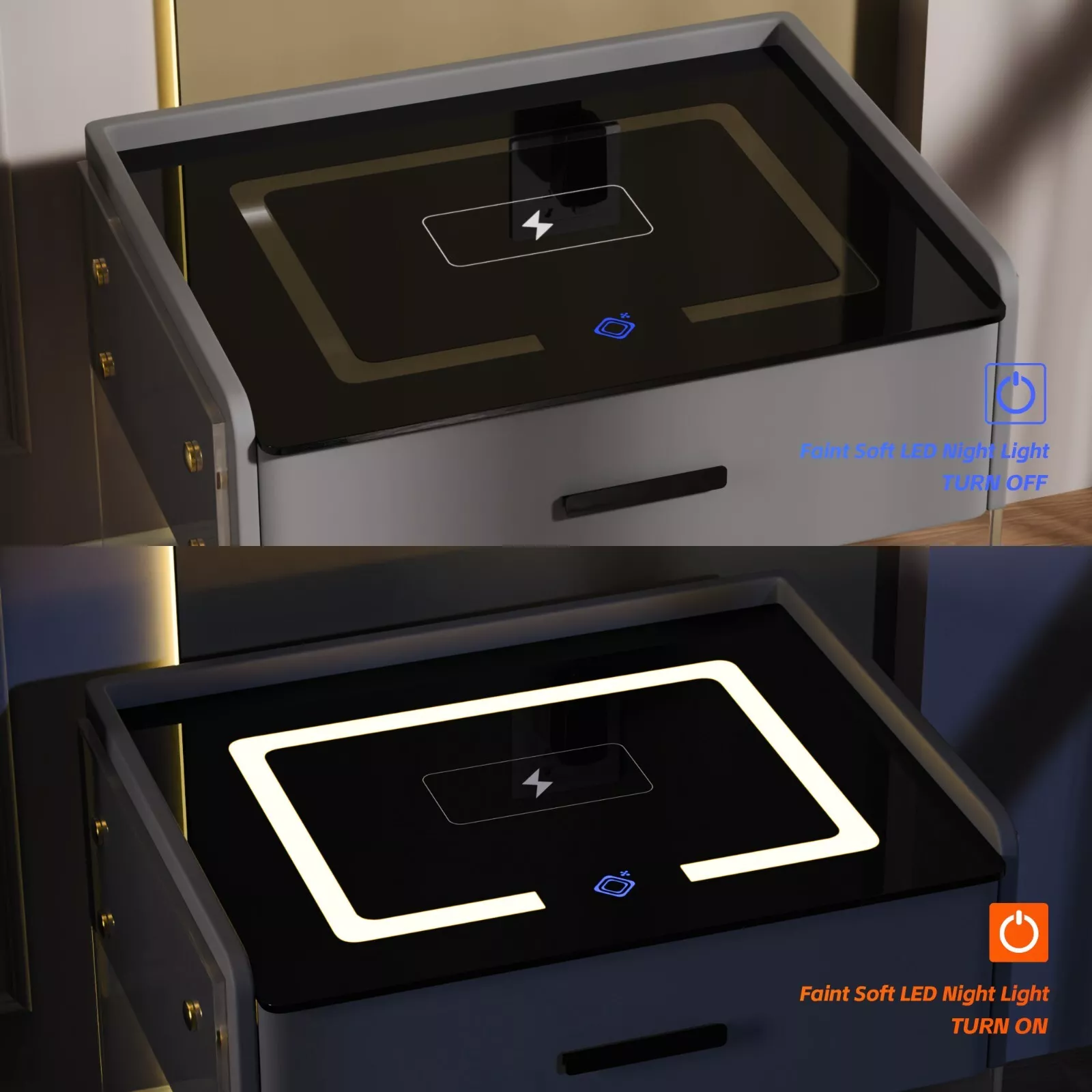Mesita de noche inteligente con carga inalámbrica, iluminación LED, 1 cajón de almacenamiento – verde, diseño moderno de vidrio y madera