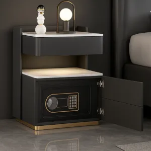 Transforma tu dormitorio en un espacio moderno, seguro y confortable con esta mesita de noche inteligente gris antracita. Más que un mueble, es tu asistente personal para cargar tus dispositivos, iluminar tu habitación y proteger tus objetos de valor.