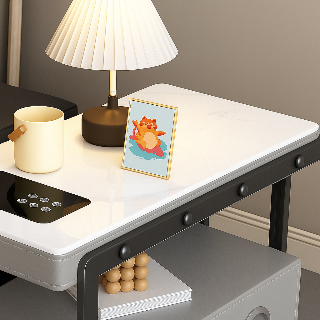 - Materiales: Vidrio templado, piedra sinterizada, cuero PU, contrachapado y acero